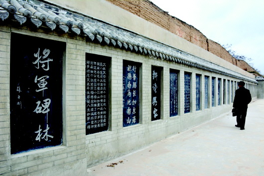 中岔古堡一堡三院,分為前院、中院、后院。走進(jìn)古堡,堡門左側(cè)建有戲樓,上書“中岔劇場”四字。戲樓(又稱戲臺)始建于清光緒年間,上世紀(jì)六七十年代曾重修過。近堡門處右側(cè)堡墻下修建有兩處一體化的石碑長廊一直通向后院,碑廊中石碑一塊接著一塊砌筑在青磚墻內(nèi),石碑與石碑之間以青磚分隔,上覆筒瓦和滴水防護(hù),每一通石碑上都刻有中華人民共和國將軍書寫的一幅書法作品。第一通石碑上甘谷籍將軍張臣剛書寫的“將軍碑林”四字分外醒目,劉精松、邢世忠、裴懷亮、李乾元等數(shù)十位叱咤風(fēng)云的共和國將軍書寫的書法碑刻依次嵌進(jìn)墻內(nèi),組成一個氣勢磅礴、雄偉壯觀的將軍書法長廊,這就是新建的將軍碑林。