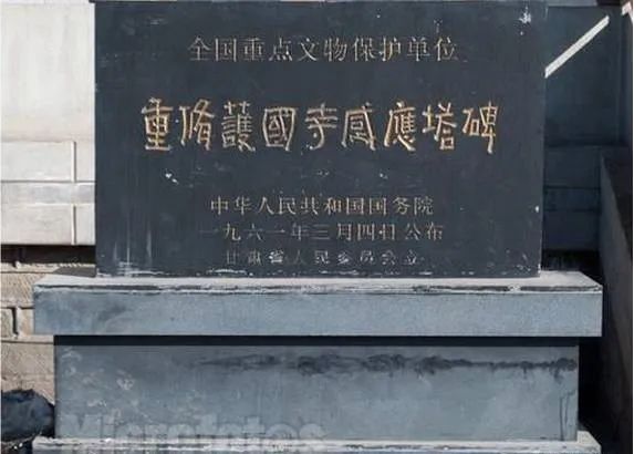 西夏碑,本名《涼州重修護國寺感通塔碑銘》,碑高26米,寬1米,厚03米。碑首呈半圓形,兩面正中用漢文和西夏文篆額,邊陰刻對稱的伎樂舞女,翩翩起舞,動作優(yōu)美,造型準確;舞女胸和手腕上有飾物,赤露上身、雙腳,下著長裙,面形肌肉豐滿,吸收了敦煌飛天的藝術(shù)特點。碑身的兩邊呈殺角,邊上刻忍冬紋。碑一面為西夏文,共28行,滿行65字。西夏文是一種被人們遺忘了的語言文字,無法辨認,當時被稱為“天書”。但碑的陽面為漢文,共26行,滿行76字。張澍先生見碑陽文末尾有“天祐民安五年歲次甲戌十五日戊建”落款,“天祐民安”為西夏年號,遂判定此碑為西夏碑文,因此,人們以后稱之為西夏碑。1961年就被國務(wù)院公布列為全國第一批重點文物保護單位。