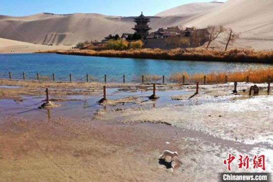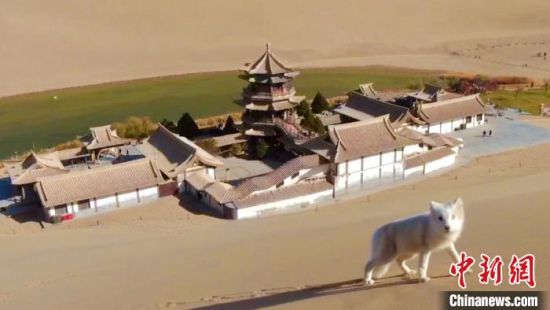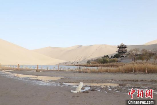 小白狐“打卡”甘肅敦煌鳴沙山月牙泉景區(qū)