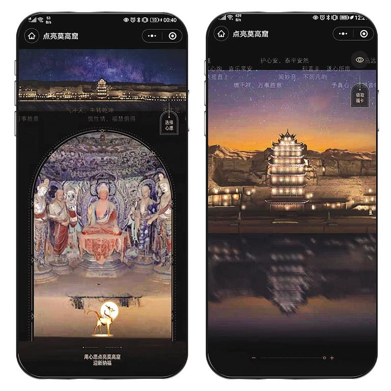 為了感受千年前莫高窟的燃燈民俗,記者迫不及待地體驗了一把:進入“云游敦煌”官方小程序,通過“點亮莫高窟”入口,即可欣賞星空下的莫高窟全景,并與萬千用戶一起“點亮”崖體上的洞窟。隨著用戶點亮人次增多,畫面中燈光的亮度也隨之增加。至深夜時分,用戶將會看到莫高窟崖體上空“銀河”與洞窟光亮相映成輝的景象,體驗千年前莫高窟燃燈盛況。“點亮莫高窟”的創(chuàng)意來自于敦煌文獻中記載的場景,莫高窟燃燈是敦煌歲時民俗。據(jù)記載,每逢特定的時間,當?shù)孛癖姇谀呖吲e行盛大的燃燈活動,于窟龕點亮燈盞??偀魯?shù)可高達700余盞。