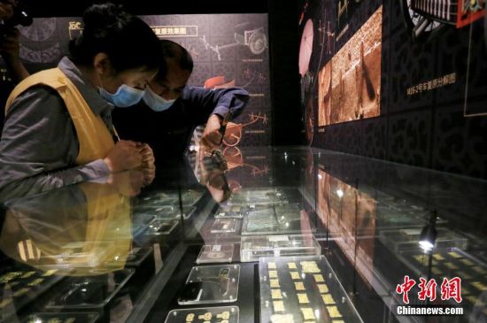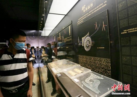 5月18日,蘭州民眾在甘肅省博物館參觀馬家塬出土的車馬飾、車馬器。中新社記者 高展 攝