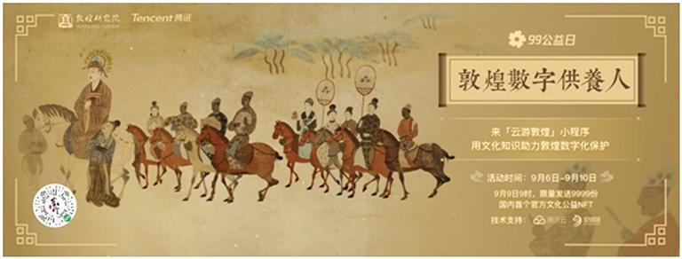 除了創(chuàng)意互動帶來的新奇體驗,敦煌研究院與騰訊在“99公益日”還將發(fā)布文博行業(yè)首個公益NFT(Non-Fungible Token,非同質(zhì)化通證)藏品。9月9日9時開始,用戶在“云游敦煌”小程序參與文化答題即有機會獲得這款限量數(shù)字藏品。這份NFT藏品生動呈現(xiàn)了《張議潮統(tǒng)軍出行圖》與《宋國河內(nèi)郡夫人宋氏出行圖》壁畫的細節(jié),并首次讓用戶在線上觀看到敦煌莫高窟第156窟的全景。