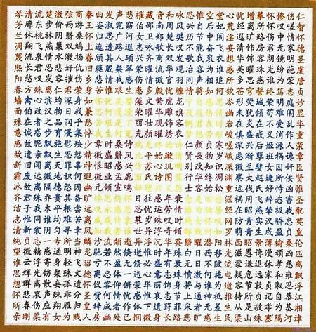 蘇蕙《璇璣圖》不僅是一束厚重的文學(xué)奇葩,也是一幅充滿創(chuàng)意的藝術(shù)巨制。她將詩歌的載體從傳統(tǒng)簡帛紙張轉(zhuǎn)換成為錦。錦是有彩色花紋的高級絲織品。以錦為書寫材料制作《璇璣圖》,除詩歌本身的創(chuàng)作外,首先需要染絲紡織。錦織好后,又要對《璇璣圖》謀篇布局,劃區(qū)設(shè)色,書詩于錦,然后一針一針地將它繡出來,變?yōu)榛匚腻\字。那每一道工序,要求都極精細(xì),不得有半點(diǎn)疏忽,不然就會留下污點(diǎn)和遺憾。蘇蕙集眾藝于一身,完美地將其制作出來,體現(xiàn)了她的綜合藝術(shù)才能。取名“璇璣(泛指北斗)圖”,寓意它像北斗,可以旋轉(zhuǎn)地讀。它是在華美的錦上,又以五彩繽紛的絲線繡上《璇璣圖》,不僅顏色更加艷麗,而且那841個金玉珠璣般文字,展現(xiàn)的令人眼花繚亂的詩歌園地,更是前不見古人,后不見來者,比錦繡的光彩更加耀眼奪目。