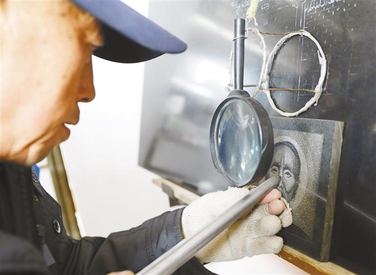 在大理石板上雕刻,是傳統(tǒng)手工技藝影雕的一種。這種雕刻方式采用墨玉、山西黑等純色石材,經(jīng)過水磨拋光后,在磨光面上要把雕琢的圖像輪廓描繪出來,根據(jù)黑白明暗成像原理,用特制的像針一樣細小的合金鋼頭工具,通過運用腕力調節(jié)針點疏密粗細、深淺和虛實線變化而表現(xiàn)圖像。