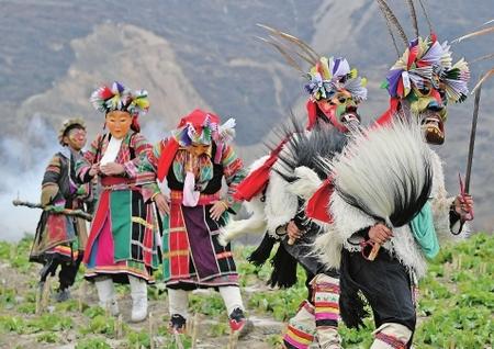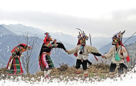 文縣鐵樓鄉(xiāng)麥貢山村,當(dāng)?shù)鼐幼〉臇|亞最古老部族白馬藏族用自己獨(dú)特的民俗——跳“池哥晝”,歡度元宵佳節(jié)。
