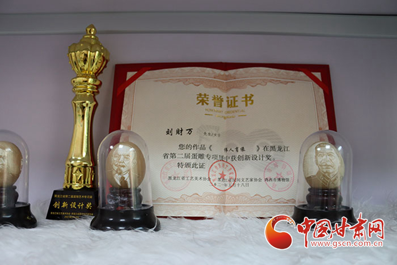 記者在采訪中注意到,社區(qū)的展柜一角擺放著不少獲獎(jiǎng)證書(shū),其中一張是在2021年的全國(guó)蛋雕專(zhuān)項(xiàng)展上,為劉財(cái)萬(wàn)作品《偉人肖像》頒發(fā)的創(chuàng)新設(shè)計(jì)獎(jiǎng)證書(shū)。“目前正在為全國(guó)蛋雕藝術(shù)聯(lián)展作準(zhǔn)備”,當(dāng)記者問(wèn)起下一步打算時(shí),劉財(cái)萬(wàn)顯得信心十足。