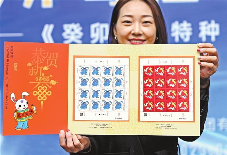 中國甘肅網(wǎng)1月6日訊 據(jù)蘭州晨報(bào)報(bào)道(奔流新聞·蘭州晨報(bào)記者王思璇)1月5日,中國郵政發(fā)行《癸卯年》特種郵票1套2枚,圖案內(nèi)容分別為:癸卯寄福、同圓共生,這套特種票是中國生肖郵票第四輪中的第八套。同日,《癸卯年》特種郵票在蘭州市各集郵營業(yè)網(wǎng)點(diǎn)發(fā)售。