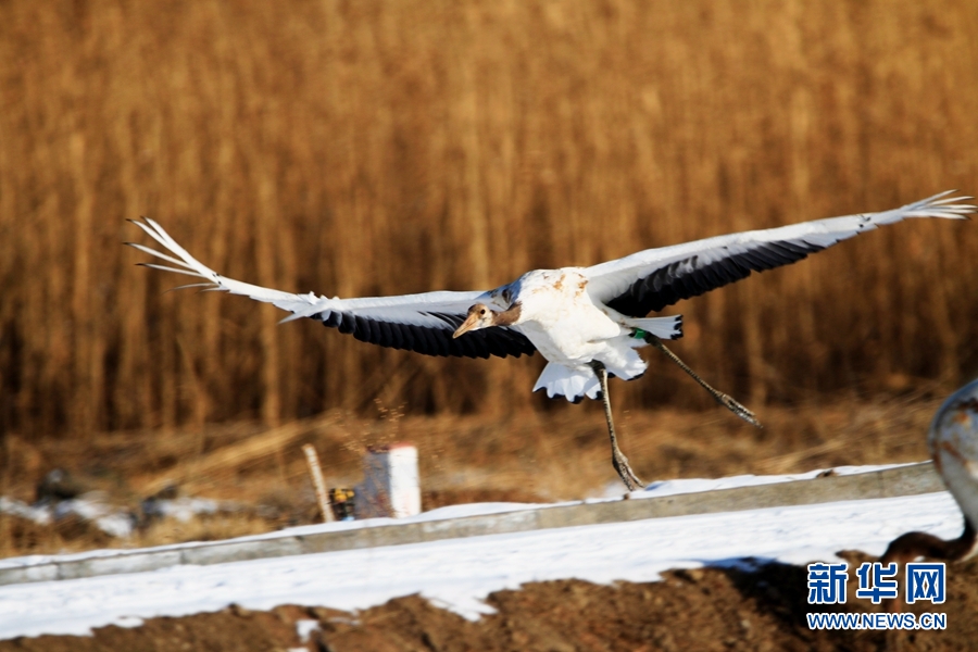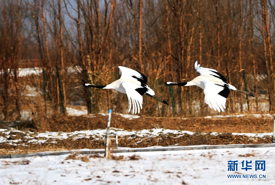 2月14日,雪后初晴,甘肅省張掖國家濕地公園放飛的十余只丹頂鶴翩翩起舞、嬉戲覓食,使雪后的濕地公園充滿生機(jī)。新華網(wǎng)發(fā)(陳禮 攝)