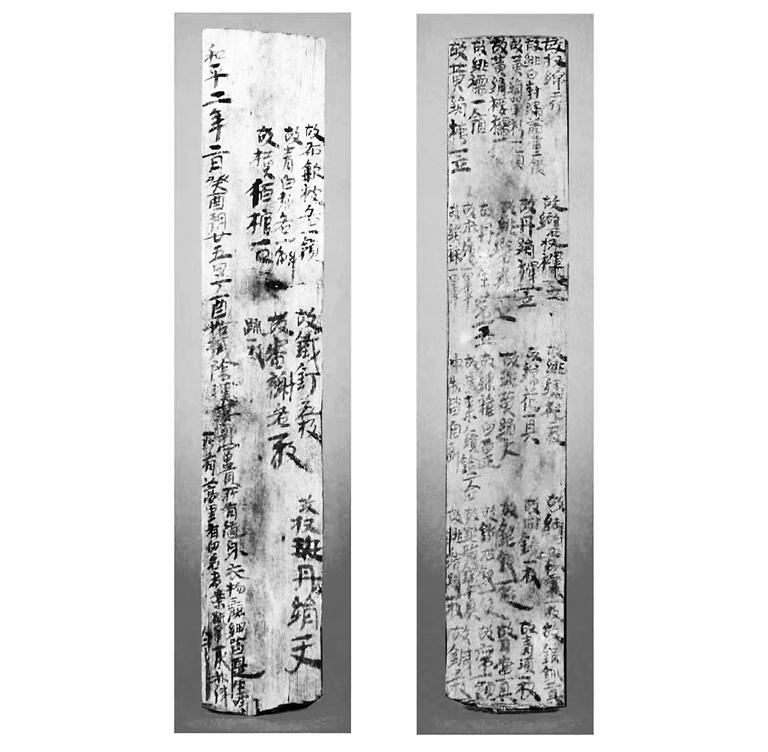 衣物疏木質,保存基本完好,長37.2厘米,寬6.5-6.9厘米,厚0.6-1.1厘米。衣物疏在墓中的主要作用是記載墓主隨葬衣飾和物品的名稱及數(shù)量。由于保存較好,此衣物疏上的字跡至今清晰可辨。衣物疏背面有“和平元年姑臧陰漢妻郭富貴”字樣,據(jù)此內容可知這件衣物疏為前涼姑臧(今武威)居民陰漢之妻郭富貴亡故后的隨葬衣物疏,且極有可能出土于姑臧(今武威)。