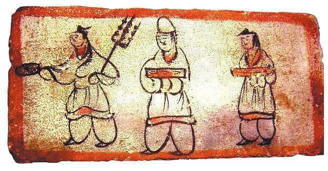 河西麥制的面食是一絕,在那時(shí)也是河西居民的主食,人們能用它做出品類繁多的面點(diǎn)。豐富的舌尖體驗(yàn),來(lái)自于湯餅和蒸餅。在壁畫(huà)磚中,有侍女們?cè)诖蟾字泻兔娴膱?chǎng)景。