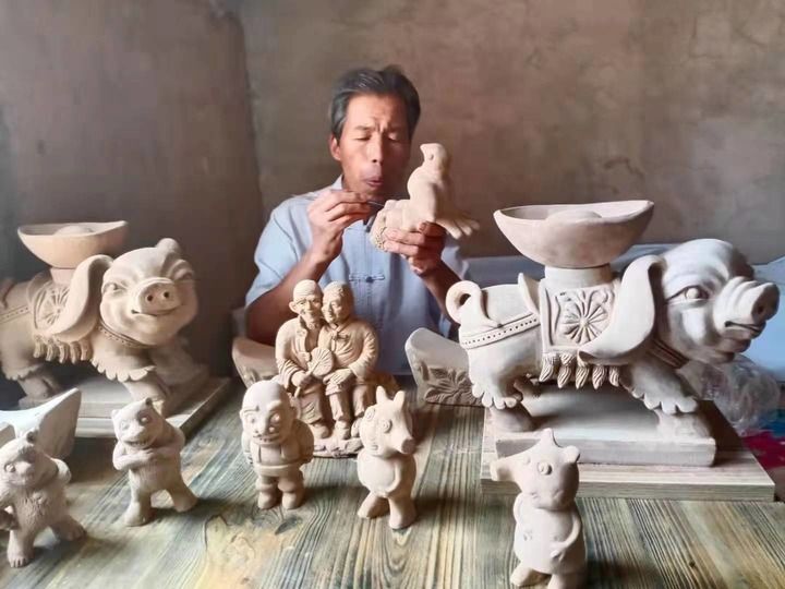 2022年6月,甘肅省平?jīng)鍪蟹俏镔|(zhì)文化遺產(chǎn)項(xiàng)目“泥塑”的第四代傳承人劉泉在雕刻泥塑制品。新華社發(fā)(石軍攝)
