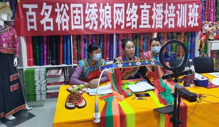2021年11月,獲得甘肅省鄉(xiāng)村工匠名師稱號(hào)的潘小紅(中)帶領(lǐng)姐妹通過(guò)網(wǎng)絡(luò)直播幫助更多人學(xué)習(xí)刺繡技巧。新華社發(fā)(佘萬(wàn)青攝)