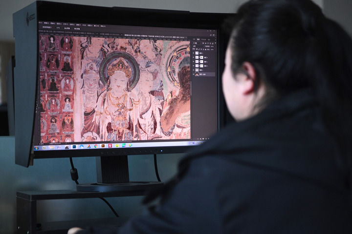 2023年4月25日,敦煌研究院文物數(shù)字化保護團隊圖像處理人員年海麗在拼接壁畫圖像。 新華每日電訊記者 陳斌 攝
