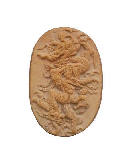 1990年出土于莊浪縣水洛鎮(zhèn)寺坪塬遺址。高11.7厘米,寬7.9厘米,厚1.5厘米,呈橢圓形。泥質(zhì)紅陶,背面平素。畫(huà)面表現(xiàn)的是某神話故事,正面飾淺浮雕紋飾,正中為一巨龍張牙舞爪、怒目圓睜、奮力騰空,一女神左手緊抓龍角,右手持劍欲砍龍首;龍頸部有一女神拿繩索套縛,另一女神在龍胸部作拔劍狀;一力士則用力拽龍尾,凸目張嘴,聲色驚恐萬(wàn)分;在龍的后肢旁還有一女神右手握劍砍殺。五神皆神態(tài)各異,造型逼真,生動(dòng)表現(xiàn)了五神伏龍時(shí)驚心動(dòng)魄的場(chǎng)景。