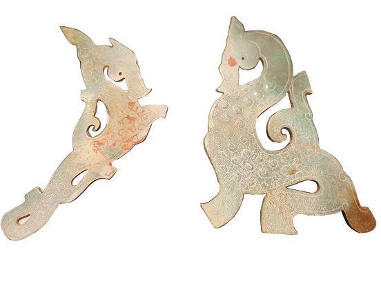 這對(duì)戰(zhàn)國(guó)谷紋玉龍,一個(gè)完整,一個(gè)略有殘缺。春秋戰(zhàn)國(guó)的龍,龍身很長(zhǎng),蜿蜒曲折,一般成對(duì)出現(xiàn)。龍身的裝飾,以谷紋或勾云紋為主,造型較多見(jiàn)的有蟠龍、行龍、虬龍、夔龍。戰(zhàn)國(guó)的龍身形態(tài)各異,基本上有個(gè)共同特點(diǎn)—“水滴眼”,龍頭多為“連云頭”,廓線出鋒,棱角分明。裝飾上多為陰刻和浮雕工藝。