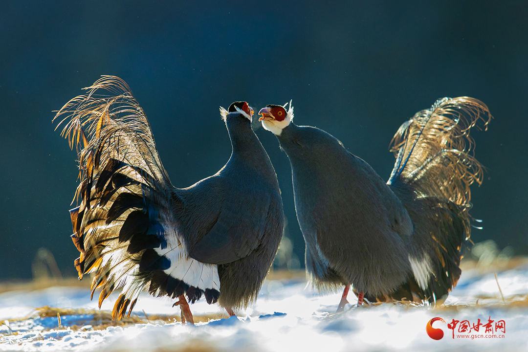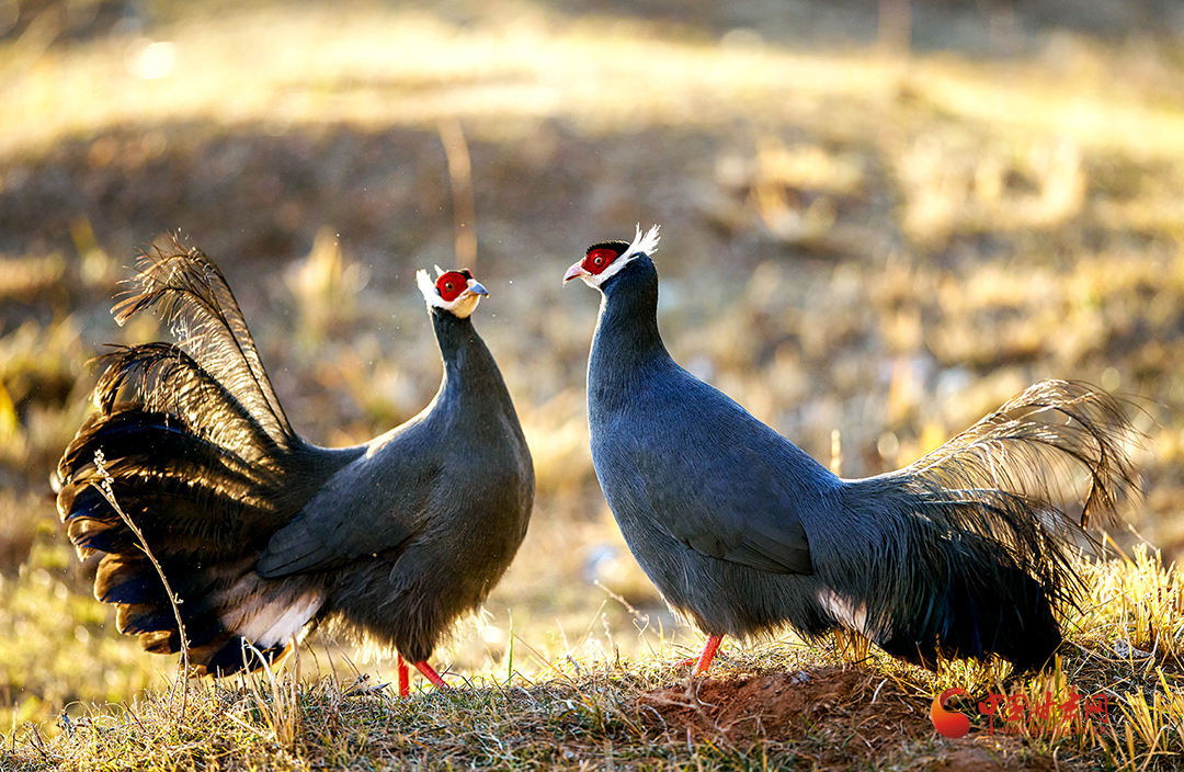 近日,祁連山國家公園甘肅省管理局張掖分局工作人員拍攝到國家二級保護野生動物藍馬雞覓食嬉戲場景。