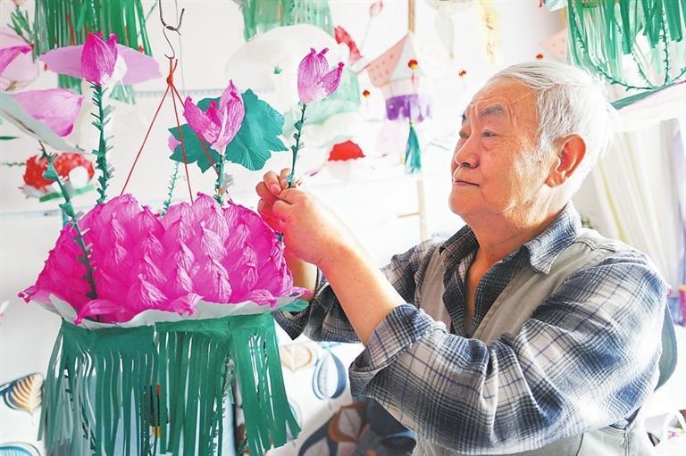 從選擇扎彩燈的竹子、劃竹篾、綁架子、染紙、糊紙、繪畫(huà)、貼字到成型完工,全由他自己一個(gè)人完成。