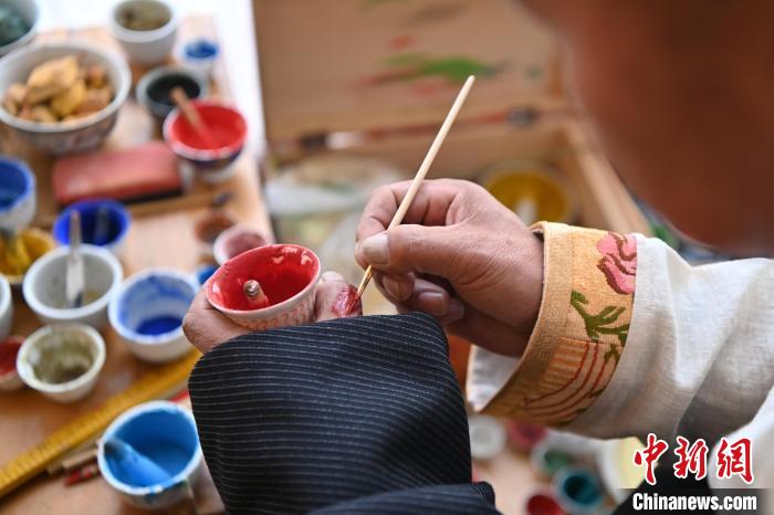 圖為交巴加布在其工作室內(nèi)給唐卡上色。他擅長運用細(xì)膩的筆觸和豐富的色彩,將人物形象刻畫得栩栩如生,生動逼真。每一幅唐卡都仿佛是一個故事,充滿了生命力和情感。九美旦增 攝