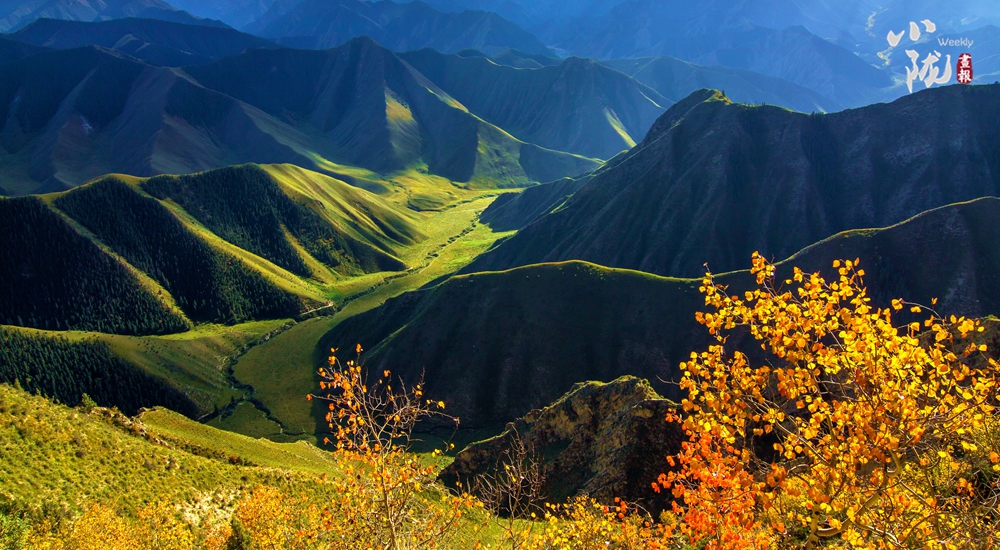 祁連主峰在藍(lán)天白云的映襯下顯得肅穆大氣。周圍群峰羅列、層巒疊嶂,高低延綿的山脈在陽(yáng)光的照耀下交相輝映,近處的群山被此起彼伏的林海包圍,像一道道五彩的波浪,郁郁蔥蔥,生機(jī)盎然。