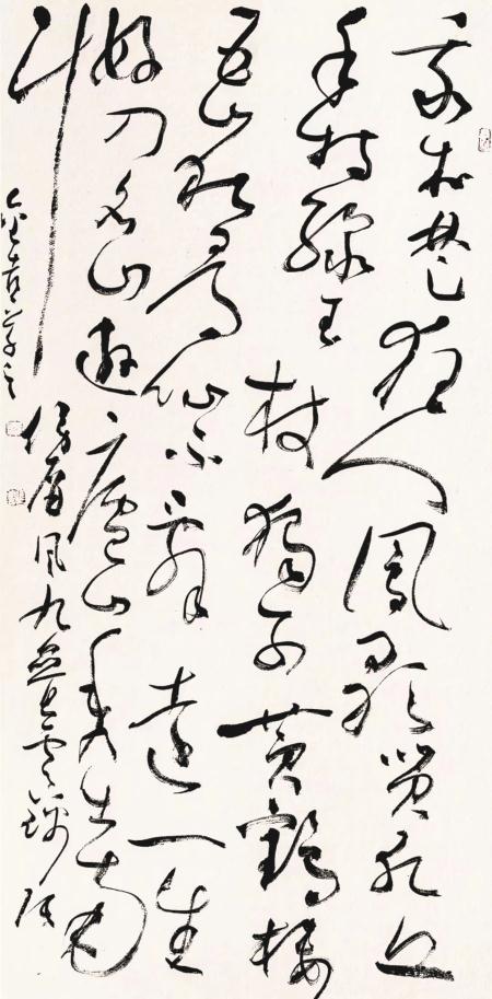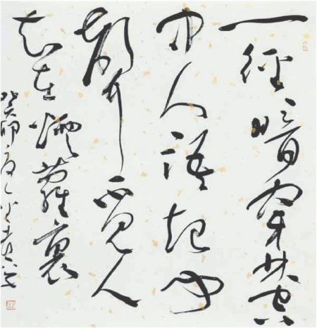 走出去,站在全國的高度,集中進(jìn)行學(xué)習(xí)和交流,對一個立志進(jìn)取的書法家,可以說是一個脫胎換骨的修煉,中國書法發(fā)展的當(dāng)代狀態(tài),成為進(jìn)取的最大參照,風(fēng)格極力貼近時代風(fēng)尚,在此基礎(chǔ)之上加入個人的鮮活語素,在作品中即表現(xiàn)出了時尚,又有自己的構(gòu)想,才有自己的一席之地。侯金喜抓住時代脈搏,積極捕捉在展覽中尚處于不顯眼的元素,不斷加以顯化,使個人的作品在龐大的展出體系中獨(dú)具風(fēng)采,難度可想而知,在高手如林的態(tài)勢下,侯金喜知難而上、刻苦磨煉,向經(jīng)典取法,向當(dāng)代名家問路,雙向融合、求新求變,經(jīng)過了這樣一個長的時段的求索,他的草書在全國眾多的草書家中拔地而起,引發(fā)了廣泛的關(guān)注??此牟輹兓亩劝盐赵诹艘粋€比較妥帖的度上,他不以奇異詭變?yōu)槌缟校P畫塑造大體以傳統(tǒng)語言為宗,使柔和與剛健統(tǒng)馭在一起,這種立意基本圍繞中國書法流變的中軸線,可以受到時間的考驗(yàn),在一些筆畫中注入的時代信息,經(jīng)過個人的藝術(shù)提煉,具有了新的生氣。在結(jié)構(gòu)選擇上,他同樣進(jìn)行了深思熟慮,反復(fù)篩汰了過度追求時髦的招數(shù),一直強(qiáng)調(diào)深層次的內(nèi)涵,把一個結(jié)體放在歷史的縱向上反復(fù)琢磨,他自己認(rèn)為,形象造型只有沿著時序的推進(jìn),才能有機(jī)地融入歷史,成為藝術(shù)的終極選擇,所以侯金喜的探索是審慎的,邁進(jìn)是疊復(fù)的,我們欣賞他的作品,可以看出他思考的勤謹(jǐn),每一個階段都有不同的表達(dá),欣賞者隨著他的筆觸的流瀉,可以領(lǐng)略到豐富的視覺享受。