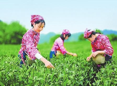 走進(jìn)茶園里,看到數(shù)名茶農(nóng)身挎小竹籮,慢慢穿行在茶樹之間,只見她們動作快速而嫻熟,一捻一放,徐徐前行在滿眼的綠意里。