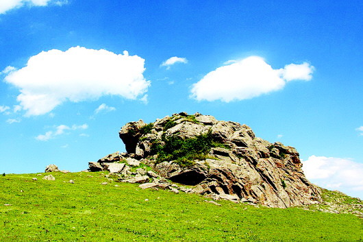 秦人遠(yuǎn)去了,只留下那些讓后人至今懷想不已的地名,諸如石鼓山、景墩梁、牧馬梁、上店子、下店子、大卜峪、瓦泉峪等,而尤以石鼓山最為著名,著名得連那部白發(fā)三千丈的《水經(jīng)注》里,都記載著它的故事:“山在梧中聚,有石鼓不擊自鳴,鳴則兵起。漢成帝鴻嘉三年,天水冀南山有大石自鳴,聲隱隱如雷,有頃止,聞?dòng)谄较宥偎氖?,野雞皆鳴。石長(zhǎng)丈三尺,廣厚略等,在崖勒,去地百余丈,民俗名曰石鼓。”石鼓山是朱圉山最高峰,海拔2625米,山峰陡峭,人跡罕至,遠(yuǎn)望如石鼓,近看似臥牛,茂林幽泉,森秀無比。初春時(shí)節(jié),萬物透綠而石鼓白雪皚皚;大雨前夕,飛鳥翱翔而山上煙云彌漫。更為神奇的是,山丘之巔,突兀一石,酷似一頭臥北朝南的耕牛,翹首做犀牛望月之狀,人稱臥牛山。臥牛山石頸之下,有一巨石,其面圓而平,每當(dāng)正午陽光直射之時(shí),遠(yuǎn)遠(yuǎn)望去,石面宛如獸皮所蒙,恰如一面威風(fēng)凜凜的巨型戰(zhàn)鼓,恍惚之中,有如雷聲隱隱而來,民呼之曰石鼓,石鼓山因此得名。石鼓山素來以厚重的人文歷史和優(yōu)美的草原風(fēng)光而著稱,尤為聞名的“石鼓擎雪”,自古就是“甘谷八景”之一。千百年來,石鼓山甘愿舍棄繁華,遠(yuǎn)離人世,在淡泊寧?kù)o的歲月中,固執(zhí)而堅(jiān)定地守望古坡,守望古坡人家。
