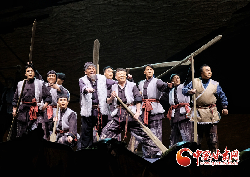 首演當晚,一曲黃河特色的“花兒”開場,將觀眾帶回到20世紀30年代末蘭州筏客子在黃河激流中勇敢拼搏的時代。劇中,筏客子們在經(jīng)歷了碼頭爭奪、蘭州遭受日軍轟炸、金城壯烈犧牲等重重考驗后,在國家危難時刻,舍棄個人恩怨,團結(jié)起來支援抗戰(zhàn),組成水上大型運輸隊,將大量物資安全送達抗戰(zhàn)前線。