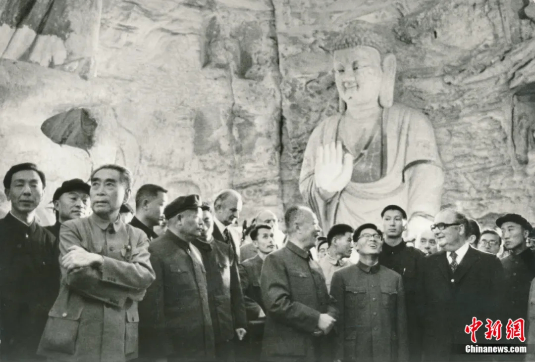 1973年9月15日,周恩來(lái)總理陪同時(shí)任法國(guó)總統(tǒng)喬治·蓬皮杜視察云岡石窟。云岡研究院 供圖