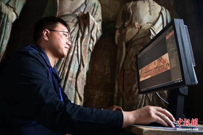 甘肅天水,工作人員在麥積山石窟內(nèi)檢查數(shù)字化掃描的造像和壁畫(huà)信息。九美旦增 攝