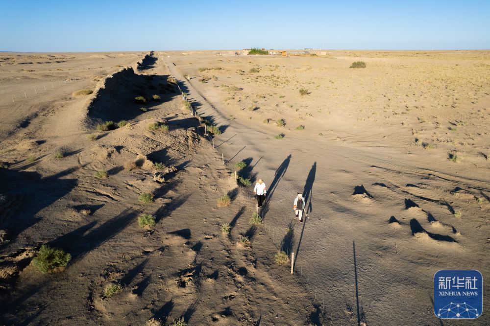 ↑這是張吉全和聞春瑜夫婦負(fù)責(zé)巡護(hù)的一段漢長(zhǎng)城遺址(7月16日攝,無(wú)人機(jī)照片)。