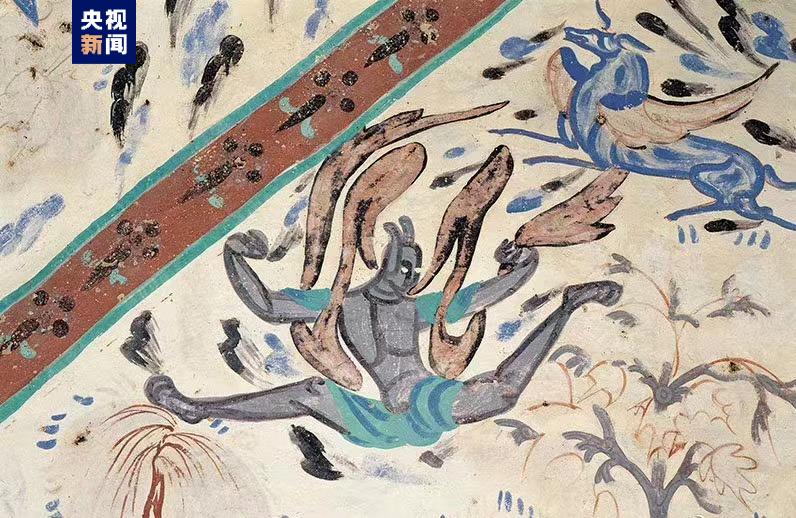 賽跑:圖中羽人奮力奔跑,腿呈一字形跨跳,騰空而起,雙手握飄帶,表現(xiàn)出凌空飛躍情景。莫高窟第249窟,西魏。