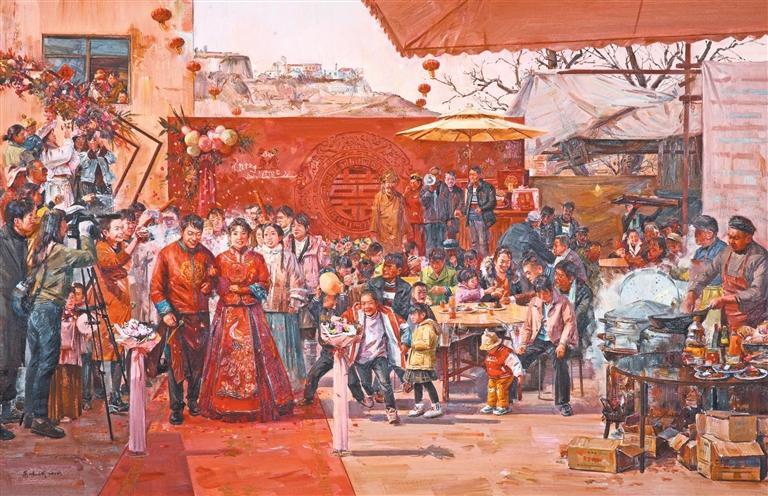 《成紀(jì)二月喜盈門》描繪了秦安一對新人舉辦婚禮的場景。身著傳統(tǒng)服飾的新人,在親朋好友祝福中朝觀眾走來。靜心觀察,會發(fā)現(xiàn)每個人都充滿鮮明的角色感,樸拙的外表、內(nèi)蘊(yùn)的情感、濃厚的民俗、歡樂的場景,共同交織成一方地域上的斑斕畫卷。