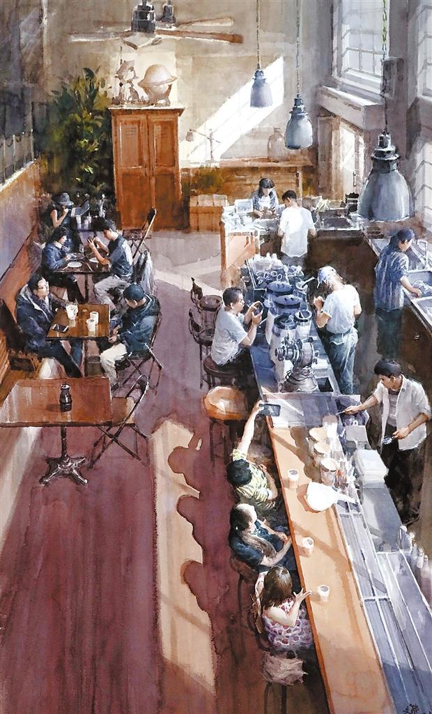《網(wǎng)紅咖啡館的午后》用寫實方法展現(xiàn)了一個溫馨的生活場景。在構(gòu)圖上,以俯視的角度用大場景來做整體畫面的籌劃,在整體色調(diào)上以沉穩(wěn)厚重的暖色作為基調(diào),把光線穿插、引入到畫面中。在布局上,以陽光照耀下的咖啡館吧臺為主要表現(xiàn)組群,分別刻畫、塑造了工作中的前臺人員、打卡拍照的女性顧客群;把暗部區(qū)域,幾組在咖啡桌邊交談、用餐、喝咖啡的顧客群作為第二層次,展現(xiàn)他們不同的神情和體態(tài);然后完善整體的空間感。在用筆上盡量以松動的筆觸,又能展現(xiàn)細(xì)節(jié)的方式來塑造,利用水彩畫需要干、濕、松、緊相結(jié)合,多層次、多遍數(shù)進(jìn)行渲染的特性,盡可能達(dá)到預(yù)期效果。 (本版文圖由甘肅省美術(shù)家協(xié)會提供)