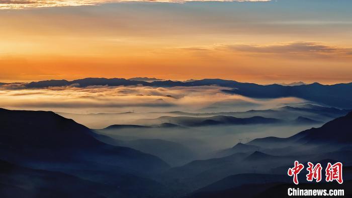 8月14日晚,蘭州市榆中縣馬坡鄉(xiāng),夕陽(yáng)在云海里翻滾,映照大地和村莊城鎮(zhèn),美不勝收。圖為云海日落籠罩黛青色山脈。丁永睿 攝