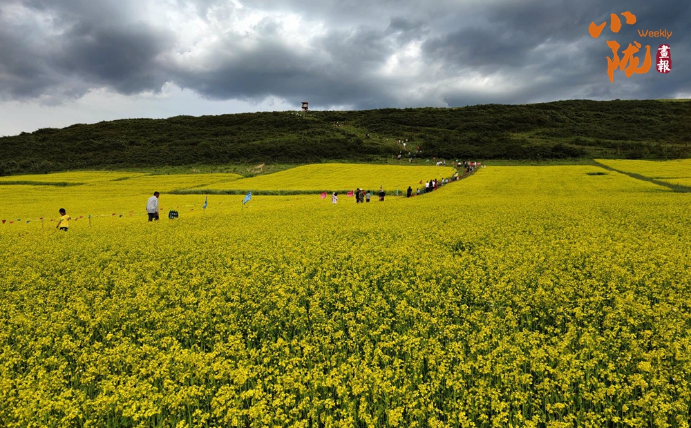 一場細(xì)雨過后,微風(fēng)吹拂,金黃色的花朵隨風(fēng)搖曳。游客們置身花海,賞花、拍照,盡情享受大自然饋贈的田園詩意。