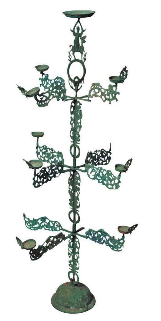▲1969年出土于武威市雷臺(tái)漢墓。燈呈樹(shù)形,由燈盞、葉、干枝和座等部分組成。燈座為覆缽狀,飾瑞獸紋和云氣紋。燈的主干為三段套插而成,每段均飾有連環(huán)和鏤空葉片,段與段銜接處各有一個(gè)十字形托架。十字托橫向四出,四端各飾透雕花葉一個(gè), 每層花葉紋飾各不相同,葉端承托小燈盞一只,燈盞外沿各有桃形葉飾一個(gè),象征火焰。主干頂端為鏤雕仙人騎鹿形花飾,仙人雙臂高舉托一大燈盞。原有燈13盞,現(xiàn)存9盞。