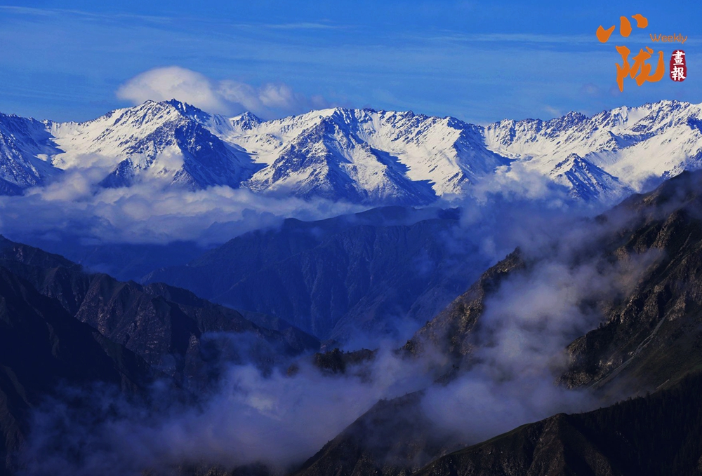 湛藍(lán)的天空下祁連雪峰銀裝素裹,峰巒間云霧繚繞,秋意蔓延。群山莽莽,天地一色,展現(xiàn)出祁連山獨(dú)有的雄渾和壯美。