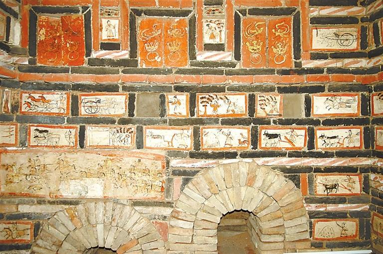 魏晉十六國(guó)磚畫在墓中的布局、組合,體現(xiàn)出 “滿”和“層”的特點(diǎn)。整個(gè)墓室,各方位、各邊角以及過(guò)道均鑲砌畫磚。以嘉峪關(guān)果園—新城5號(hào)墓畫磚的布局為例,各層間隔、同層緊鄰的畫磚,給觀者的感覺(jué)就是整幅壁畫,但每一塊又是一個(gè)獨(dú)立的畫面,這種“樣式”,是魏晉十六國(guó)時(shí)期的河西匠工、畫工,在繼承漢晉磚室墓的同時(shí),將畫像磚在墓室布局的方式也加以接受。艷麗的色彩,“忠實(shí)”生活的寫實(shí)手法,又是河西畫匠們的創(chuàng)新和發(fā)揮。