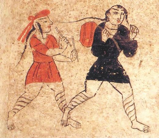 除此之外,河西彩繪壁畫磚圖像中,還有一些反映娛樂(lè)的圖像,主要有樂(lè)舞圖和六博圖。高臺(tái)地埂坡壁畫中的“角抵百戲”中,一著辮者在作表演,他小腿部網(wǎng)狀綁腿,蹲踞,雙手?jǐn)傞_(kāi),似乎是在表演魔術(shù),又似乎是在歡迎到場(chǎng)的人們。“擊鼓”中,兩人網(wǎng)狀繃腿,髡發(fā)梳辮,著黑裝者背鼓,著紅裝者持雙鼓槌準(zhǔn)備擊鼓。孫機(jī)先生謂,戰(zhàn)國(guó)迄漢盛行六博,博具和博戲的圖像在考古資料中不乏其例。甘肅以武威磨嘴子漢墓出土木六博俑為例。六博俑以簡(jiǎn)單明確的藝術(shù)造型,刻畫了兩個(gè)老者全神貫注博弈的場(chǎng)面,惟妙惟肖地表現(xiàn)出對(duì)弈時(shí)蓄勢(shì)待發(fā)的場(chǎng)面。在高臺(tái)壁畫墓中的博戲場(chǎng)面略有不同,二博者戴船形帽,打手勢(shì)。從相貌看,很可能是少數(shù)民族。高臺(tái)出土彩繪壁畫磚上,兩人動(dòng)作幅度更大,左邊一人的黃紅色著裝和博具上的零散物品,顯得場(chǎng)面更為熱烈激情。