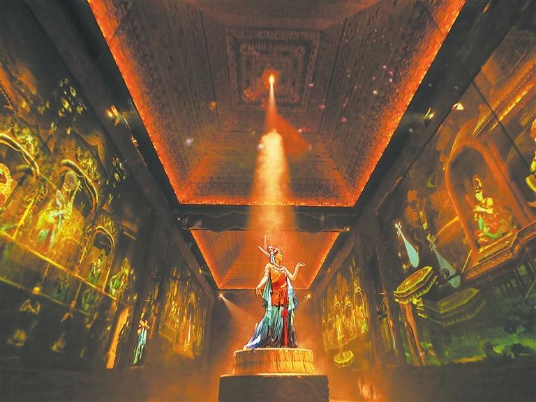 《樂動敦煌》把文化、藝術(shù)與科技三者之間相互融合、合理布局、互相成就,以科技手段推動劇情闡述和藝術(shù)呈現(xiàn),演出效果持續(xù)煥新豐富觀眾的觀演體驗。該劇開場時利用環(huán)場全息投影技術(shù)把敦煌樂舞歷史在浩瀚的文字中徐徐鋪展,男主角白歆緩緩走出,帶領(lǐng)觀眾開啟千年遺音創(chuàng)作之旅,墻壁、洞窟、蓮臺之上金剛力士、伎樂飛天在聲、光、電的配合中“活現(xiàn)”于洞窟之間,主舞臺上3D威亞復(fù)活壁畫中的飛天,反彈琵琶、天女散花交相呼應(yīng),再現(xiàn)盛世繁華。全劇將科技與內(nèi)容、形式與空間的高度融合貫穿于創(chuàng)作與演出全過程,在文化勢能與科技動能的均衡實踐中打破了人和舞臺之間的界限,讓觀眾置身劇場,近距離地欣賞演員表演,體驗光影變化,感受表演者、音樂、光影之間的交匯融合,真正實現(xiàn)了音樂、光影、表演和心靈的沉浸。