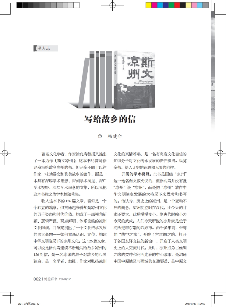 閱讀徐兆壽寫給故鄉(xiāng)的帶著滾燙體溫的126封信,總是給人一種澎湃的激情和磅礴的力量,總是讓人思接千載、視通萬里。《斯文涼州》立足絲綢之路和中華文明的歷史格局,提出了重構(gòu)涼州文化的宏大愿望,讓讀者深刻認(rèn)識(shí)到,徐兆壽的故鄉(xiāng)涼州,不單單是他日夜眷戀的熱土,而是打破了行政區(qū)劃的大地理概念,更是中華民族共同的文化符號(hào)和精神歸宿。在建設(shè)中華民族現(xiàn)代文明的今天,我們應(yīng)當(dāng)全面了解、認(rèn)識(shí)、重構(gòu)涼州文化,真正做到創(chuàng)造性轉(zhuǎn)化、創(chuàng)新性發(fā)展。認(rèn)識(shí)了這本書的價(jià)值,也就認(rèn)識(shí)了作者的價(jià)值,徐兆壽不僅是一位優(yōu)秀的文化學(xué)者、教授、作家,而且也是一位有智慧、有見地的歷史學(xué)家。
