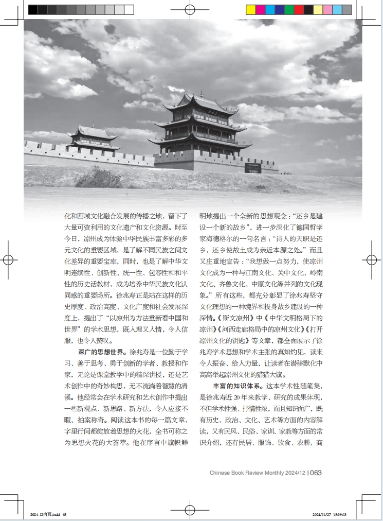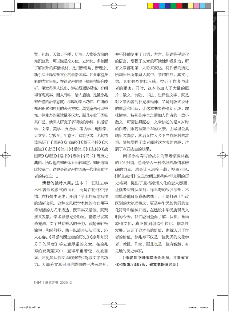 豐富的知識(shí)體系。這本學(xué)術(shù)性隨筆集,是徐兆壽近20年來教學(xué)、研究的成果體現(xiàn),不但學(xué)術(shù)性強(qiáng)、抒情性濃,而且知識(shí)面廣,既有歷史、政治、文化、藝術(shù)等方面的內(nèi)容解讀,又有民風(fēng)、民俗、家訓(xùn)、家教等方面的常識(shí)介紹,還有民居、服飾、飲食、農(nóng)耕、商貿(mào)、禮教、天象、四季、歷法、人物等方面的知識(shí)普及,可以說是全方位、立體化、多側(cè)面了解涼州的鮮活教材,是用新視角、新理念、新手法詮釋涼州文化的最新讀本。如此豐富多彩的內(nèi)容呈現(xiàn),在徐兆壽的筆下梳理得條分縷析,闡發(fā)得深入淺出,講述得通俗易懂,介紹得客觀真實(shí),耐人尋味,給人啟迪,足見徐兆壽嚴(yán)謹(jǐn)?shù)闹螌W(xué)態(tài)度、深厚的學(xué)術(shù)功底、廣博的知識(shí)積累和獨(dú)到的表達(dá)方式。瀏覽全書可以得知,徐兆壽的閱讀量不僅大,而且專業(yè)門類極其廣泛,他深入研究了多領(lǐng)域的學(xué)科,包括哲學(xué)、文學(xué)、美學(xué)、歷史學(xué)、考古學(xué)、地理學(xué)、天文學(xué)、宗教學(xué)、生態(tài)學(xué)、建筑學(xué)等,尤其精讀深研了《周易》《山海經(jīng)》《穆天子傳》《水經(jīng)注》《史記》《漢書》《后漢書》《左傳》《戰(zhàn)國(guó)策》《河圖》《洛書》《春秋》《尚書》等歷史典籍。所以他的知識(shí)體系比較豐富,知識(shí)結(jié)構(gòu)比較寬廣,這也是徐兆壽作為新一代作家和學(xué)者的特征之一。