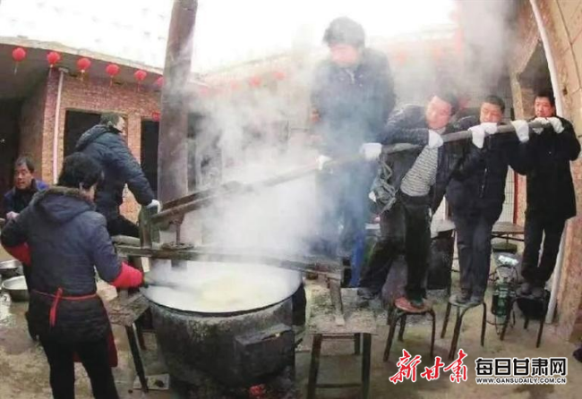 在慶陽(yáng)鄉(xiāng)村,一場(chǎng)紅白喜事的饸饹流水席往往能持續(xù)好幾天,數(shù)十張方桌一字?jǐn)[開,掌勺的主廚指揮著幫廚,以每分鐘出湯十幾碗的效率,完成著這場(chǎng)飲食行為藝術(shù)。