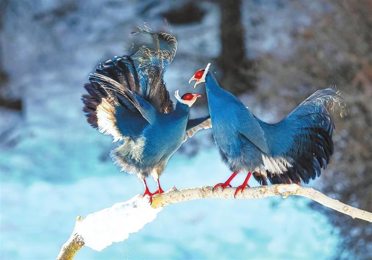 藍馬雞是珍稀名貴的禽類,頭側緋紅,耳羽簇白色、突出于頸部頂上,通體藍灰色,中央尾羽特長而翹起,尾羽披散下垂如馬尾,故名藍馬雞。冬日里,藍馬雞成群飛落山腳覓食,藍羽丹頂行走在雪地上格外搶眼。數量繁多的藍馬雞是祁連山野生山地雞的“顏值擔當”。覓食時,藍馬雞常用爪刨挖林中空地苔蘚和林緣草地,尋找掉落的云杉種子。刨食的過程會讓土壤松動,便于種子生根發(fā)芽,促進林區(qū)植物天然更新。