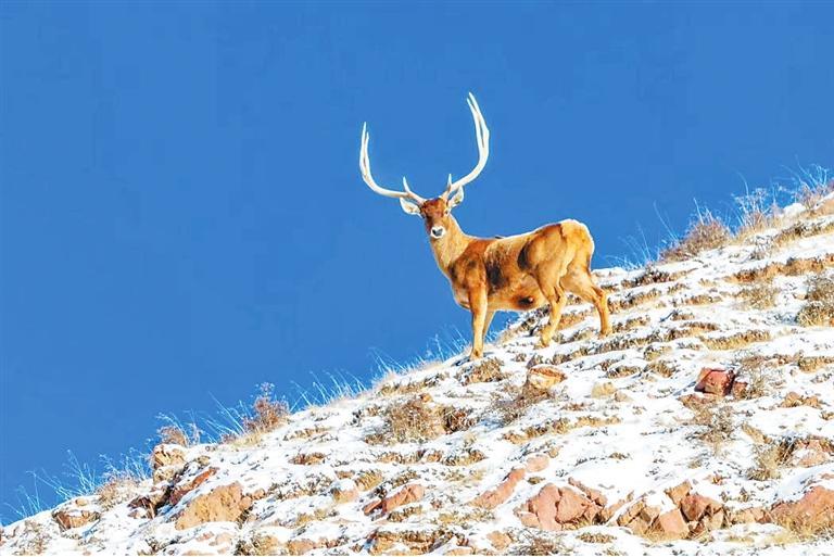 白唇鹿,是國家一級保護野生動物,中國特有鹿種,主要分布在青藏高原及其邊緣地帶的高山草原地區(qū),為典型的高寒物種,在當地老百姓眼中被視為“神鹿”。白唇鹿嘴唇的周圍和下頜為白色,故得名。