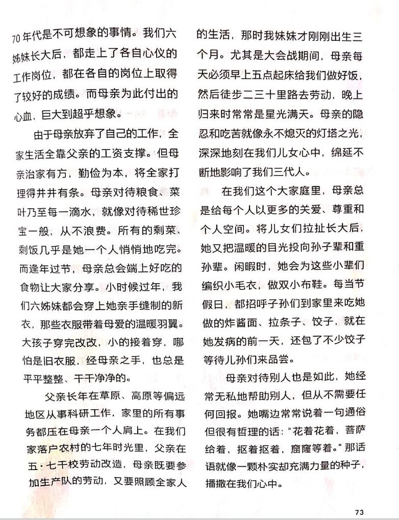 父親長年在草原、高原等偏遠(yuǎn)地區(qū)從事科研工作,家里的所有事務(wù)都壓在母親一個人肩上。在我們家落戶農(nóng)村的七年時光里,父親在五·七干校勞動改造,母親既要參加生產(chǎn)隊的勞動,又要照顧全家人的生活,那時我妹妹才剛剛出生三個月。尤其是大會戰(zhàn)期間,母親每天必須早上五點起床給我們做好飯,然后徒步二三十里路去勞動,晚上歸來時常常是星光滿天。母親的隱忍和吃苦就像永不熄滅的燈塔之光,深深地刻在我們兒女心中,綿延不斷地影響了我們?nèi)恕?/p>