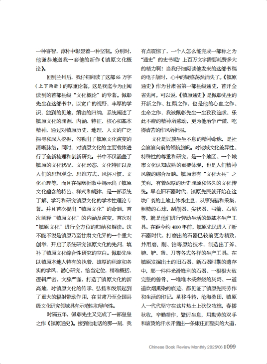 回到蘭州后,我仔細拜讀了這部85萬字(上下兩冊)的厚重論著。這是我迄今為止閱讀到的首部縣級“文化概論”的專著。佩彰先生在這部書中,以寬廣的視野,豐厚的學(xué)識,獨到的見地,縝密的歸納,系統(tǒng)闡述了鎮(zhèn)原文化的淵源、內(nèi)涵、特征、核心和基本精神,通過對鎮(zhèn)原歷史、地理、人文的廣泛探尋和深入挖掘,勾勒出了鎮(zhèn)原文化演變的清晰脈絡(luò)。同時,對鎮(zhèn)原文化的主要載體進行了全新梳理和創(chuàng)新研究。書中不僅涵蓋了鎮(zhèn)原的文化狀況、文化形態(tài)、文化特征以及人們的思想觀念、思維方式、風(fēng)俗習(xí)慣、文化心理等,而且在探幽析微中揭示出了鎮(zhèn)原文化蘊含的特色、樣式和規(guī)律,是一部系統(tǒng)了解、學(xué)習(xí)和研究鎮(zhèn)原文化的學(xué)術(shù)性理論專著。并且首次提出“鎮(zhèn)原文化”的命題,首次闡釋“鎮(zhèn)原文化”的內(nèi)涵及演變,首次對“鎮(zhèn)原文化”進行全方位的歸納和解讀。這不能不說是鎮(zhèn)原乃至甘肅文化界的一個重大創(chuàng)舉,開啟了系統(tǒng)研究鎮(zhèn)原文化的先河,填補了鎮(zhèn)原文化綜合性研究的空白。佩彰先生以鎮(zhèn)原本地人特有的執(zhí)著、雄厚的積淀和務(wù)實的學(xué)風(fēng),潛心研究,恰當定位,精準概括,邏輯嚴密,文辭嚴謹,打造了鎮(zhèn)原文化的新高地,對鎮(zhèn)原文化的傳承、弘揚和發(fā)展起到了重大的輻射帶動作用,在甘肅乃至全國縣級文化研究領(lǐng)域具有示范性和導(dǎo)向性。