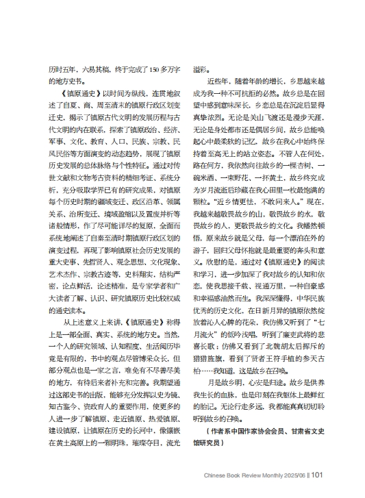 從上述意義上來講,《鎮(zhèn)原通史》稱得上是一部全面、真實、系統(tǒng)的地方史。當然,一個人的研究領(lǐng)域、認知程度、生活閱歷畢竟是有限的,書中的觀點盡管博采眾長,但部分觀點也是一家之言,難免有不盡善盡美的地方,有待后來者補充和完善。我期望通過這部史書的出版,能夠充分發(fā)揮以史為鏡、知古鑒今、資政育人的重要作用,使更多的人進一步了解鎮(zhèn)原、走近鎮(zhèn)原、熱愛鎮(zhèn)原、建設(shè)鎮(zhèn)原,讓鎮(zhèn)原在歷史的長河中,像鑲嵌在黃土高原上的一顆明珠,璀璨奪目,流光溢彩。