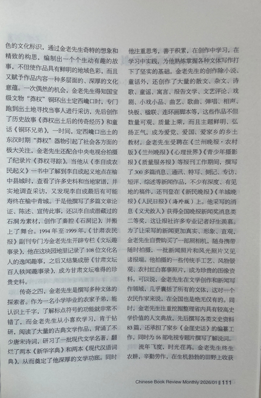 傳奇之四,金老先生是撰寫多種文體的探索者。作為一名小學(xué)畢業(yè)的農(nóng)家子弟,能認(rèn)識(shí)上千字,了解標(biāo)點(diǎn)符號(hào)的功能就非常不錯(cuò)了,而金老先生從小喜歡學(xué)習(xí),肯于鉆研,閱讀了大量的古典文學(xué)作品,背誦了不少唐宋詩(shī)詞,研習(xí)了一批現(xiàn)代文學(xué)名著,翻爛了兩本《新華字典》和兩本《現(xiàn)代漢語(yǔ)詞典》,從而奠定了他深厚的文學(xué)功底。同時(shí)他注重思考,善于積累,在創(chuàng)作中學(xué)習(xí),在學(xué)習(xí)中實(shí)踐,為他熟練掌握各種文體寫作打下了堅(jiān)實(shí)的基礎(chǔ)。金老先生的創(chuàng)作除小說(shuō)、童話外,還創(chuàng)作了大量的散文、雜文、詩(shī)歌、童謠、寓言、報(bào)告文學(xué)、文藝評(píng)論、戲劇、小戲小品、曲藝、歌曲、彈唱、相聲、快板、楹聯(lián)、連環(huán)畫腳本等,這些作品不但數(shù)量可觀、質(zhì)量上乘,而且主題鮮明、弘揚(yáng)正氣,成為愛黨、愛國(guó)、愛家鄉(xiāng)的鄉(xiāng)土教材。金老先生受聘在《蘭州晚報(bào)·農(nóng)村版》《蘭州晚報(bào)》《心理世界》《青少年攝影報(bào)》《質(zhì)量服務(wù)報(bào)》等報(bào)刊工作期間,撰寫了300多篇消息、通訊、特寫、側(cè)記、專訪、短評(píng)、綜述等新聞作品,不少有深度、有見地的稿件,還刊登在《新民晚報(bào)》《羊城晚報(bào)》《人民日?qǐng)?bào)》(海外版)上。他采寫的消息《義犬救人》獲得全國(guó)晚報(bào)新聞獎(jiǎng)消息類二等獎(jiǎng),這讓報(bào)社許多專業(yè)記者好生羨慕。為了讓采寫的新聞更加真實(shí)、形象、直觀,金老先生自費(fèi)購(gòu)買了一部照相機(jī),隨身攜帶隨時(shí)拍攝,一批新聞?wù)掌惋L(fēng)光照片又見諸報(bào)端。他拍攝的一些傳統(tǒng)手工藝、風(fēng)物景觀、農(nóng)村紅白喜事照片,成為珍貴的圖像資料??梢哉f(shuō),金老先生在文學(xué)創(chuàng)作和新聞寫作領(lǐng)域,幾乎囊括了所有的文體,這對(duì)一個(gè)農(nóng)民作家來(lái)說(shuō),在全國(guó)也是絕無(wú)僅有的。同時(shí),金老先生注重挖掘整理省內(nèi)具有較高史學(xué)價(jià)值的人文典故,先后撰寫各類文史資料83篇,還承擔(dān)了家鄉(xiāng)《金崖史話》的編纂工作,同時(shí)為16部電視專題片撰寫了解說(shuō)詞。