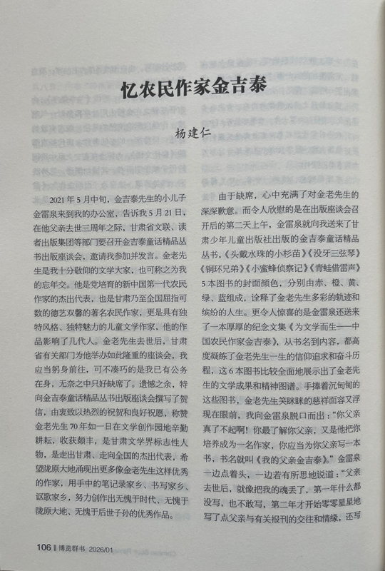 由于缺席,心中充滿了對(duì)金老先生的深深歉意。而令人欣慰的是在出版座談會(huì)召開后的第二天上午,金雷泉就向我送來(lái)了甘肅少年兒童出版社出版的金吉泰童話精品叢書,《頭戴水珠的小杉苗》《沒牙三弦琴》《銅環(huán)兄弟》《小蜜蜂偵察記》《青蛙借雷聲》5本圖書的封面顏色,分別由赤、橙、黃、綠、藍(lán)組成,詮釋了金老先生多彩的軌跡和繽紛的人生。更令人驚喜的是金雷泉還送來(lái)了一本厚厚的紀(jì)念文集《為文學(xué)而生——中國(guó)農(nóng)民作家金吉泰》,從書名到內(nèi)容,都高度凝練了金老先生一生的信仰追求和奮斗歷程,這6本圖書比較全面地展示出了金老先生的文學(xué)成果和精神圖譜。手捧著沉甸甸的這些圖書,金老先生笑瞇瞇的慈祥面容又浮現(xiàn)在眼前,我向金雷泉脫口而出:“你父親真了不起?。∧阕盍私饽愀赣H,又是他把你培養(yǎng)成為一名作家,你應(yīng)當(dāng)為你父親寫一本書,書名就叫《我的父親金吉泰》。”金雷泉一邊點(diǎn)著頭,一邊若有所思地說(shuō)道:“父親去世后,就像把我的魂丟了,第一年什么都沒寫,也不敢寫,第二年才開始零零星星地寫了點(diǎn)父親與有關(guān)報(bào)刊的交往和情緣,還寫了點(diǎn)父親在生活和寫作中的軼事趣聞。您的建議非常好,我擔(dān)心駕馭不好,試試看吧。”我感覺金雷泉有點(diǎn)為難,馬上又安慰他:“不急,你用兩三年時(shí)間慢慢寫。”